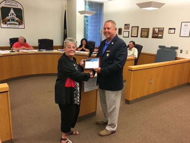 THE PENNSYLVANIA STATE BOROUGH ASSOCIATION PRESIDENT PRESENTED SOME AWARDS AT LAST NIGHT’S AMBRIDGE COUNCIL MEETING. BEAVER COUNTY RADIO NEWS CORRESPONDENT SANDY GIORDANO WAS THERE. Click on ‘play’ to hear Sandy’s report…
