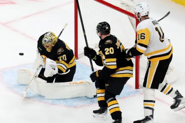 (File Photo: Source for Photo: Boston Bruins goaltender Joonas Korpisalo (70) makes a glove-save as teammate Henri Jokiharju (20) and Pittsburgh Penguins right wing Justin Brazeau (16) watch during the second period of an NHL hockey game, Sunday, Jan. 11, 2026, in Boston. (AP Photo/Mark Stockwell)