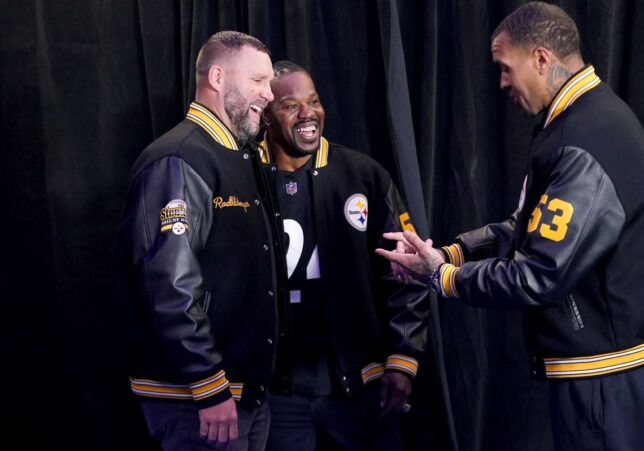 (File Photo: Source for Photo: Ben Roethlisberger (from left), Joey Porter and Maurkice Pouncey talk during a photo op for the Steelers’ Hall of Honor prior to the game against Miami on Dec. 15, 2025, at Acrisure Stadium. (Matt Freed/Post-Gazette))