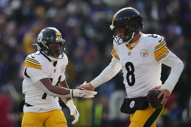 (File Photo: Source for Photo: Pittsburgh Steelers quarterback Aaron Rodgers (8) celebrates with running back Kenneth Gainwell (14) after a touchdown during the first half of an NFL football game against the Baltimore Ravens, Sunday, Dec. 7, 2025, in Baltimore. (AP Photo/Stephanie Scarbrough)
